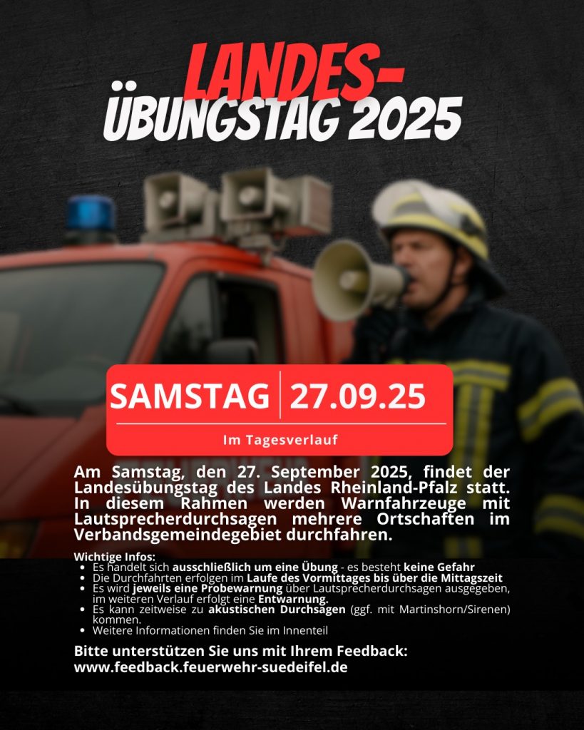 Am 27. September 2025 führt das Land Rheinland-Pfalz den ersten Landesübungstag für den Brand- und Katastrophenschutz durch. Von 8:00 bis 16:00 Uhr werden landesweit vielfältige Übungen stattfinden.